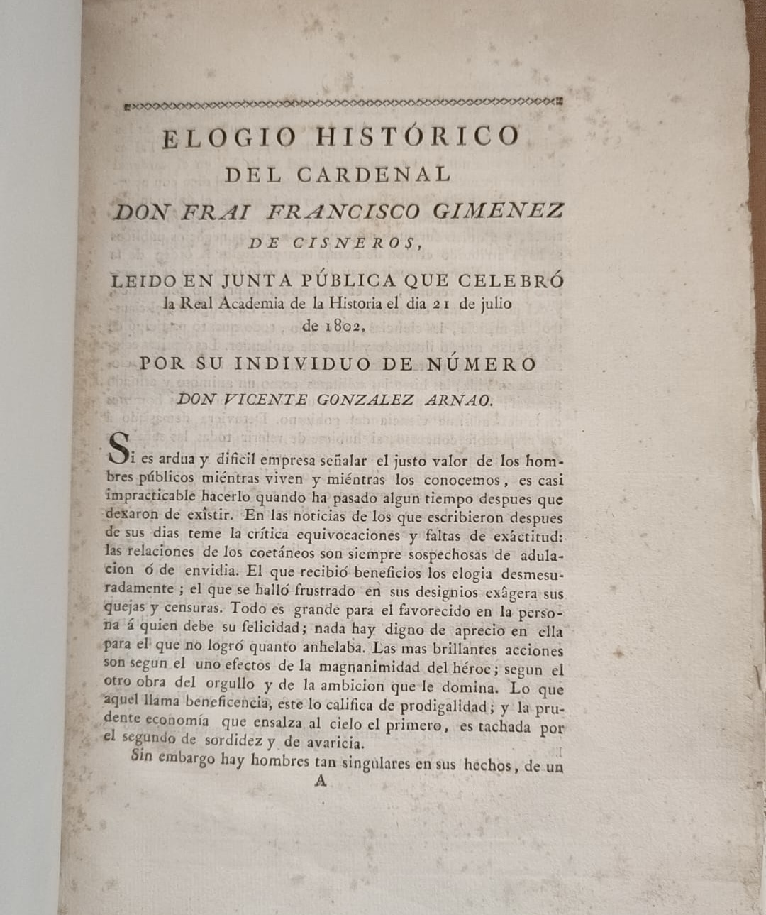 Perfecto estado de conservación. Únicamente 3 ejemplares en el CCPB. Vicente González Arnao fue un político, abogado y literato español nacido en 1776 en Madrid. Estudió derecho en la Universidad de Alcalá y obtuvo el título de doctor y el de abogado de los Reales Consejos en 1789. También se dedicó al estudio de las matemáticas, las ciencias naturales y los idiomas. En 1792 fue nombrado catedrático de Física experimental en la Universidad de Alcalá, pero renunció en 1804 para dedicarse a la abogacía.